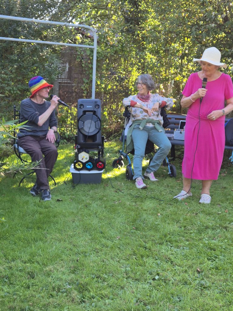Eine Mitarbeiterin führte gemeinsam mit einer Bewohnerin beeindruckende Bauchtänze auf. Im Gartenpavillion tanzten ganz spontan Gäste und Bewohner jeden Alters vergnügt miteinander. Im Anschluss konnten sich dann alle ihr Essen im Trockenen schmecken lassen. Zum gemütlichen Ausklang gab es dann noch Live-Musik im Edeltraud-Zimmer.